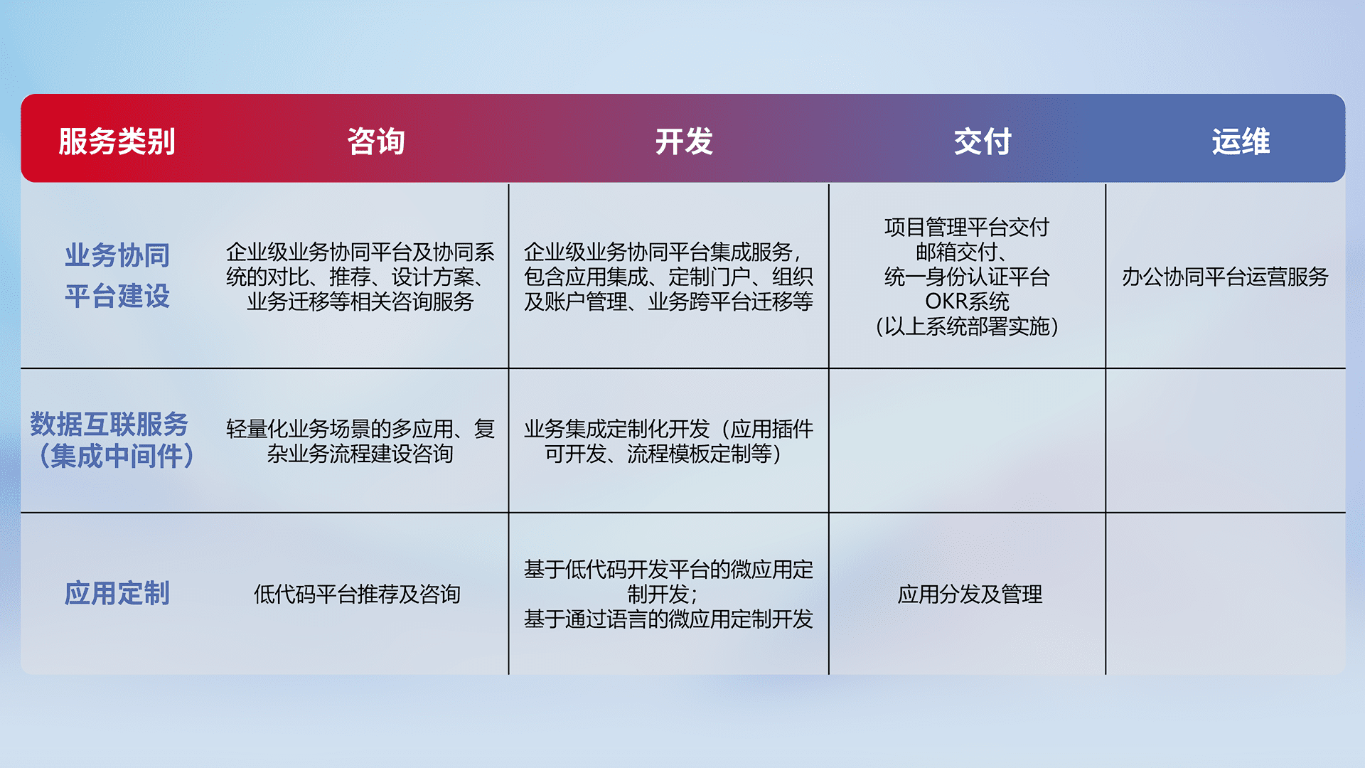 针对钉钉、、、、企微、、IDaas等平台级产品提供产品的规划、、、、方案、、、、交付、、、定制化开发等服务,,,,实现如统一协同办公、、、智能客户服务、、、、混合会议管理、、、智能数据查询、、、、等业务场景,,,,实现数字化转型。。。。